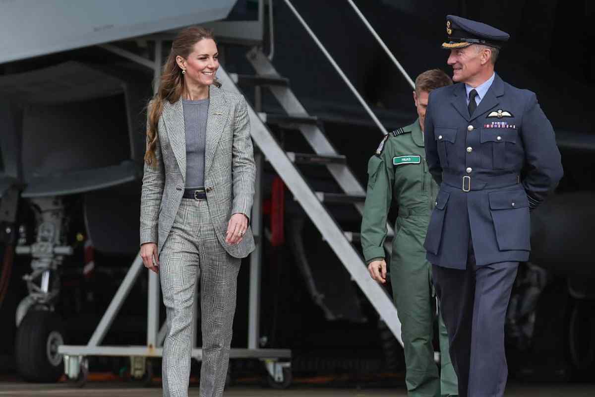 Kate Middleton, invece, ha indossato il blazer per un impegno ufficiale, visitando una stazione della Royal Air Force con suo solito stile sobrio. La duchessa lo ha portato aperto, con un sotto giacca in maglia tono su tono, pantaloni a sigaretta e pumps scamosciate blu navy, elegante ma funzionale.
